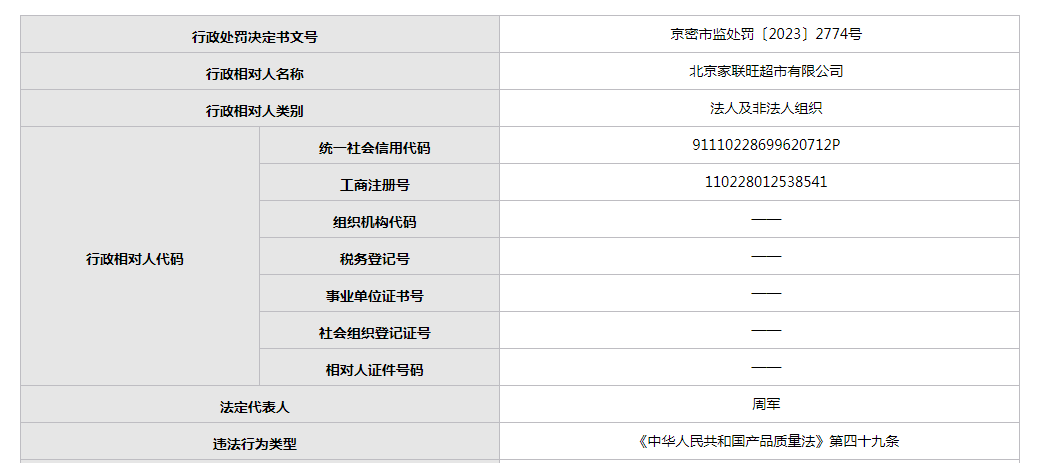 中國(guó)質(zhì)量新聞網(wǎng)訊(閆冬)近日,北京市市場(chǎng)監(jiān)督管理局網(wǎng)站公開一則行政處罰決定書。北京家聯(lián)旺超市有限公司(以下簡(jiǎn)稱當(dāng)事人)因違反《中華人民共和國(guó)產(chǎn)品質(zhì)量法》被市場(chǎng)監(jiān)管部門處罰。