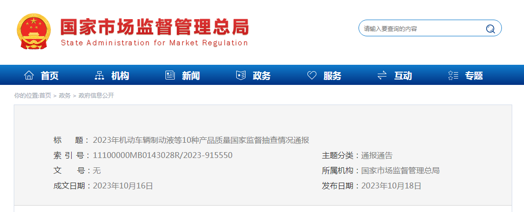 中國質(zhì)量新聞網(wǎng)訊 10月18日,市場監(jiān)管總局網(wǎng)站通報(bào)2023年機(jī)動(dòng)車輛制動(dòng)液等10種產(chǎn)品質(zhì)量國家監(jiān)督抽查情況。