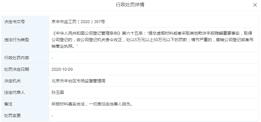 此外,天眼查平臺(tái)顯示,該公司曾有一條行政處罰。2020年10月發(fā)布的京豐市監(jiān)工罰(2020)387號(hào)顯示,該公司的違法行為類型為《中華人民共和國公司登記管理?xiàng)l例》第六十五條:“提交虛假材料或者采取其他欺詐手段隱瞞重要事實(shí),取得公司登記的,由公司登記機(jī)關(guān)責(zé)令改正,處以5萬元以上50萬元以下的罰款;情節(jié)嚴(yán)重的,撤銷公司登記或者吊銷營業(yè)執(zhí)照?!?/p>