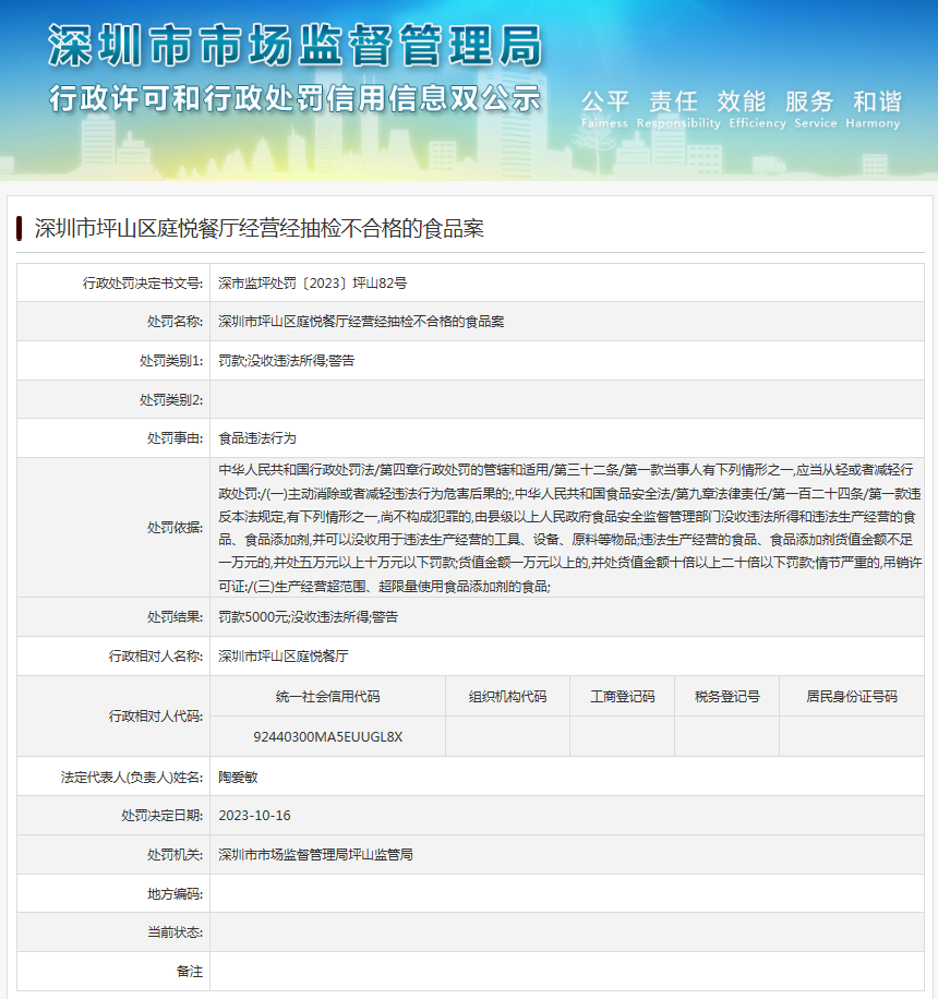 中國質(zhì)量新聞網(wǎng)訊 近日,深圳市市場監(jiān)督管理局坪山監(jiān)管局發(fā)布行政處罰信息(深市監(jiān)坪處罰〔2023〕坪山82號),涉及深圳市坪山區(qū)庭悅餐廳經(jīng)營經(jīng)抽檢不合格的食品案。