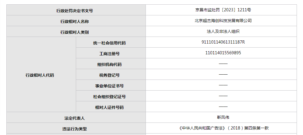 中國質(zhì)量新聞網(wǎng)訊(閆冬)近日,北京市市場監(jiān)督管理局網(wǎng)站公開一則行政處罰決定書。北京超杰海創(chuàng)科技發(fā)展有限公司(以下簡稱當(dāng)事人)因違反《中華人民共和國廣告法》被市場監(jiān)管部門處罰。