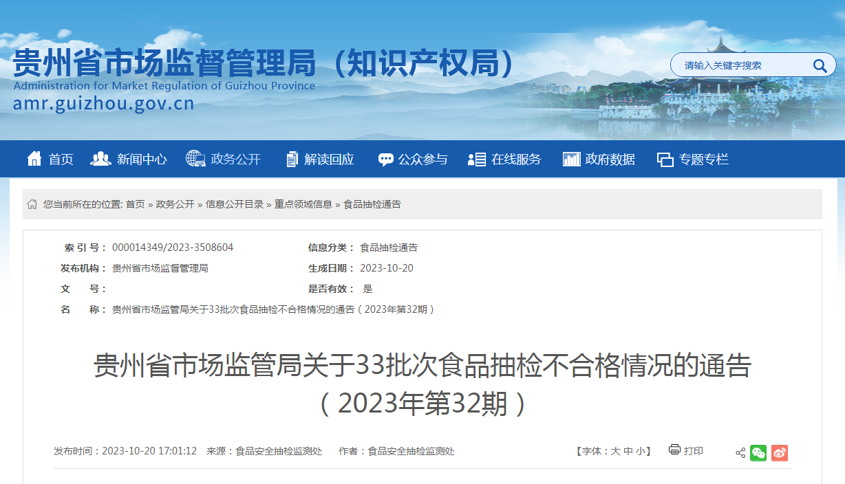 中國質(zhì)量新聞網(wǎng)訊 10月20日,貴州省市場監(jiān)管局發(fā)布關(guān)于33批次食品抽檢不合格情況的通告(2023年第32期)。