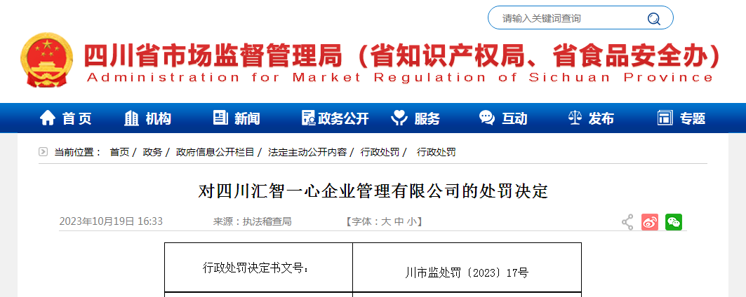 中國質量新聞網(wǎng)訊 近日,四川省市場監(jiān)督管理局網(wǎng)站發(fā)布對四川匯智一心企業(yè)管理有限公司的處罰決定。