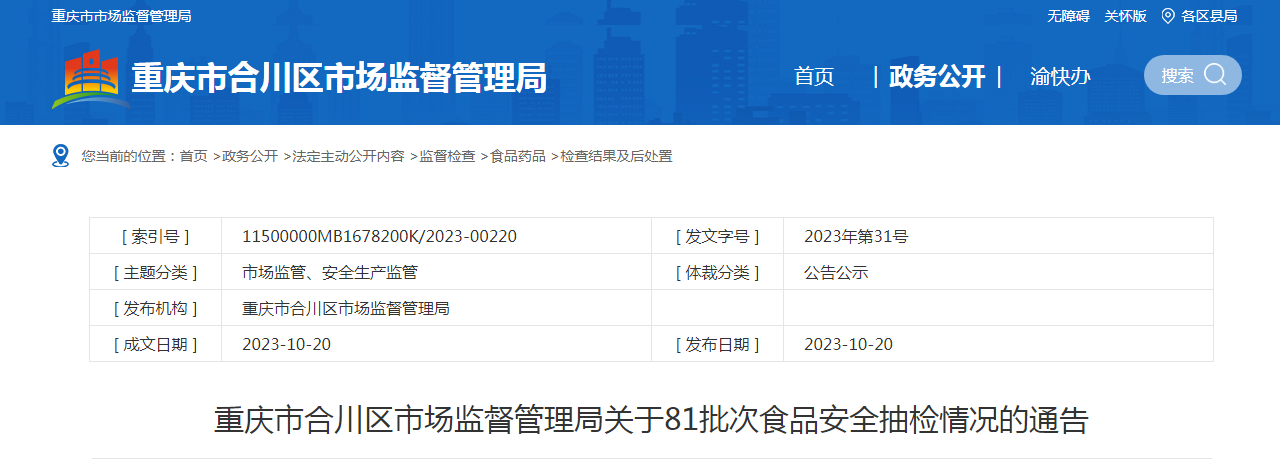 中國(guó)質(zhì)量新聞網(wǎng)訊 近日,重慶市合川區(qū)市場(chǎng)監(jiān)督管理局發(fā)布關(guān)于81批次食品安全抽檢情況的通告(2023年第31號(hào))。本次抽檢81批次樣品。其中抽樣檢驗(yàn)項(xiàng)目合格樣品76批次,不合格樣品5批次。根據(jù)食品安全國(guó)家標(biāo)準(zhǔn),個(gè)別項(xiàng)目不合格,其產(chǎn)品即判定為不合格產(chǎn)品。