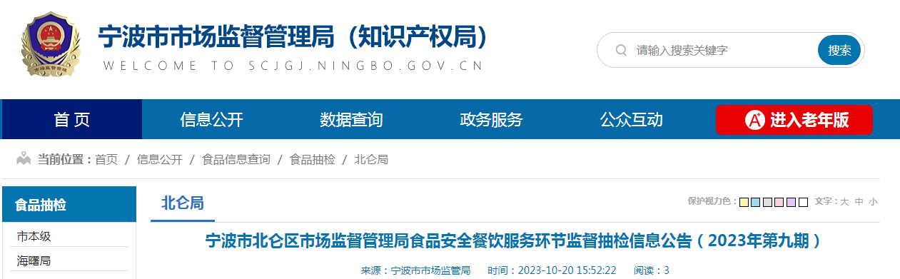 中國質量新聞網(wǎng)訊 10月20日,浙江省寧波市北侖區(qū)市場監(jiān)督管理局發(fā)布食品安全餐飲服務環(huán)節(jié)監(jiān)督抽檢信息(2023年第九期)。