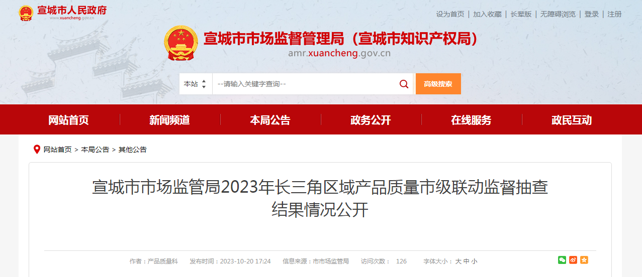 中國(guó)質(zhì)量新聞網(wǎng)訊 10月20日,安徽省宣城市市場(chǎng)監(jiān)管局公開2023年長(zhǎng)三角區(qū)域產(chǎn)品質(zhì)量市級(jí)聯(lián)動(dòng)監(jiān)督抽查結(jié)果情況。