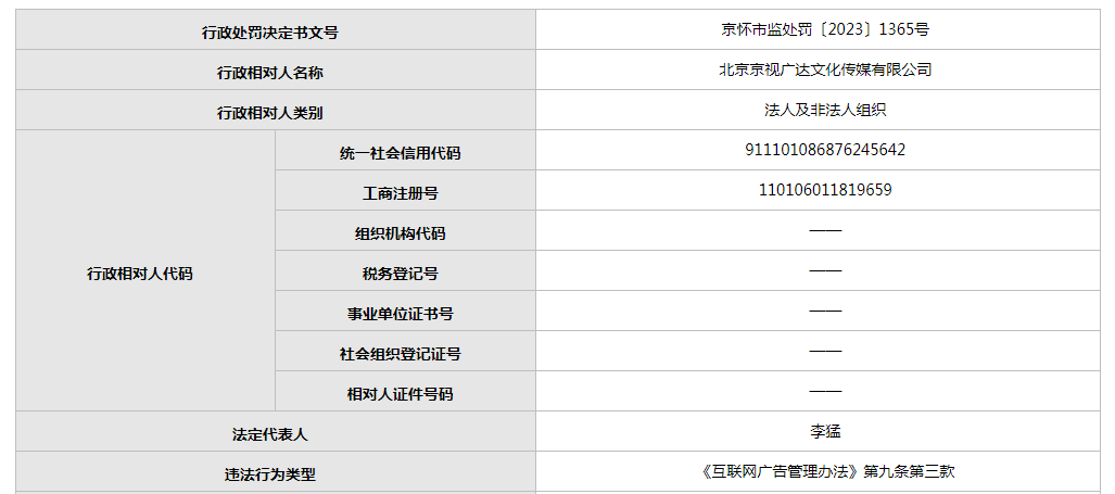 中國質(zhì)量新聞網(wǎng)訊(閆冬)近日,北京市市場(chǎng)監(jiān)督管理局網(wǎng)站公開一則行政處罰決定書。北京京視廣達(dá)文化傳媒有限公司(以下簡(jiǎn)稱當(dāng)事人)因違反《互聯(lián)網(wǎng)廣告管理辦法》被市場(chǎng)監(jiān)管部門處罰。