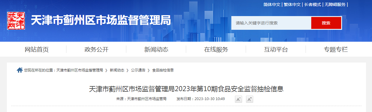 中國質(zhì)量新聞網(wǎng)訊 10月30日,天津市薊州區(qū)市場監(jiān)督管理局網(wǎng)站發(fā)布2023年第10期食品安全監(jiān)督抽檢信息。
