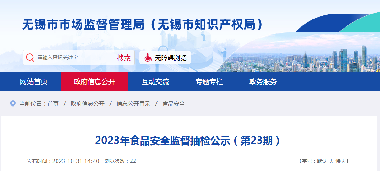 中國質(zhì)量新聞網(wǎng)訊 10月31日,江蘇省無錫市市場(chǎng)監(jiān)督管理局網(wǎng)站公示2023年食品安全監(jiān)督抽檢情況(第23期)。