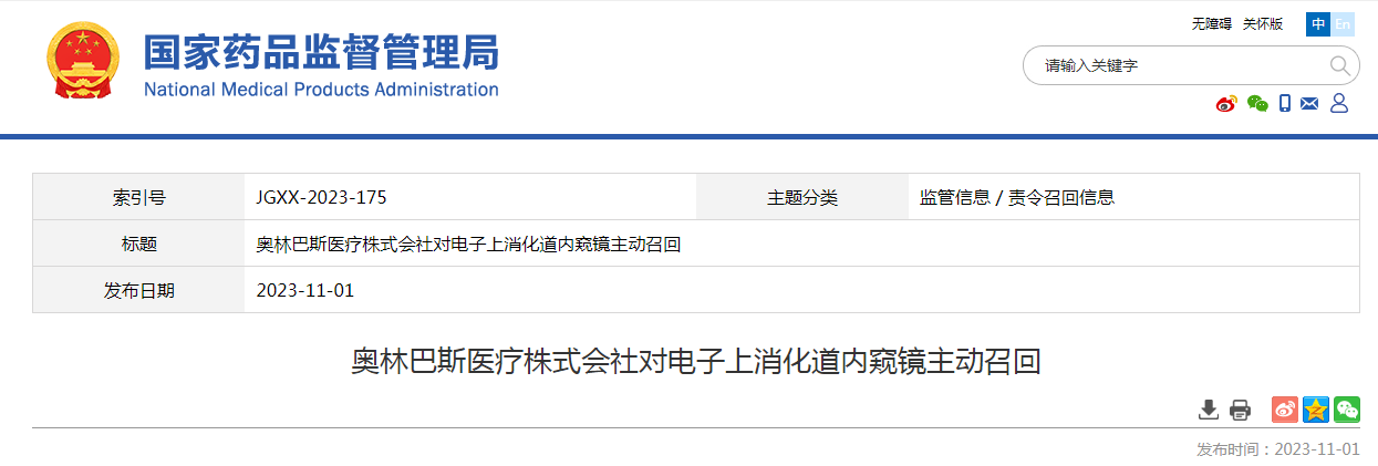 奧林巴斯貿(mào)易(上海)有限公司報(bào)告,由于涉事產(chǎn)品維修不當(dāng)?shù)仍?,生產(chǎn)商奧林巴斯醫(yī)療株式會(huì)社對(duì)其生產(chǎn)的電子上消化道內(nèi)窺鏡(國(guó)械注進(jìn)20153063036)主動(dòng)召回。召回級(jí)別為二級(jí)召回。涉及產(chǎn)品的型號(hào)、規(guī)格及批次等詳細(xì)信息見(jiàn)《醫(yī)療器械召回事件報(bào)告表》。