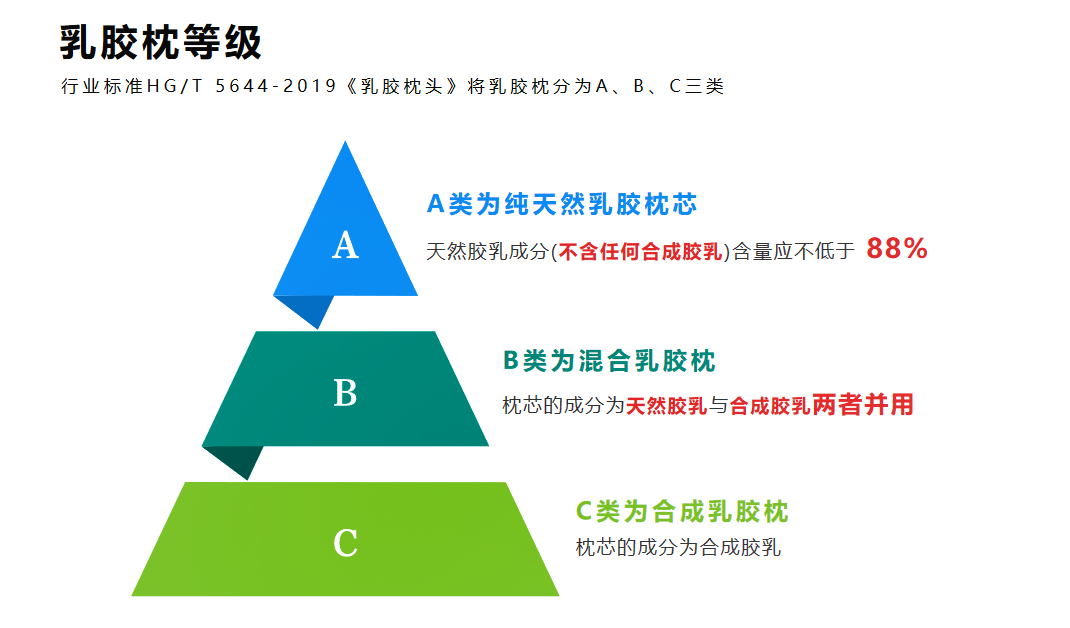 根據(jù)天然膠乳含量及成分的不同,行業(yè)標(biāo)準(zhǔn)HG/T 5644-2019《乳膠枕頭》將乳膠枕分為A、B、C三類,如下: