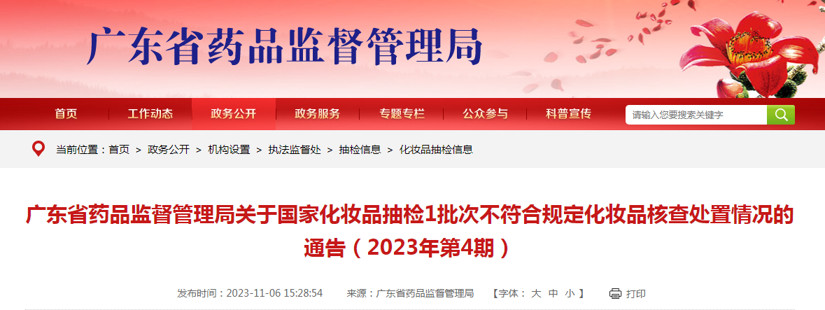 廣東省藥品監(jiān)督管理局關(guān)于國(guó)家化妝品抽檢1批次不符合規(guī)定化妝品核查處置情況的通告(2023年第4期)