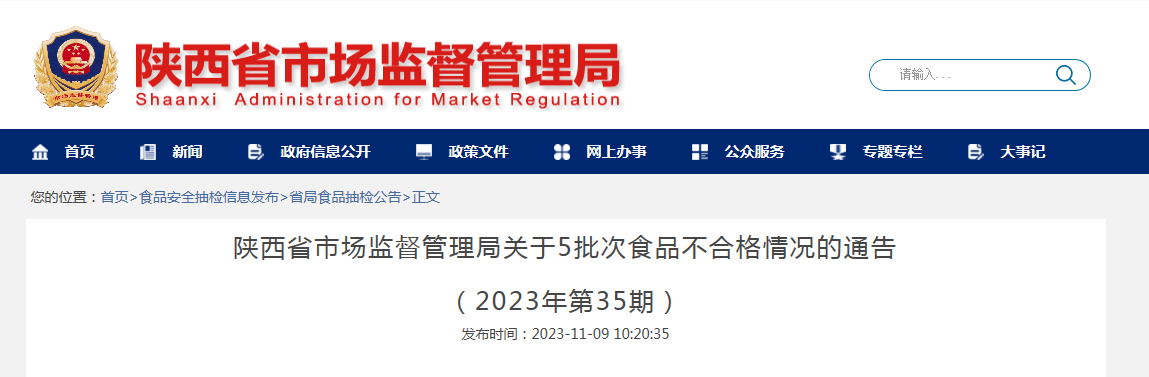 中國質(zhì)量新聞網(wǎng)訊 11月9日,陜西省市場監(jiān)督管理局網(wǎng)站發(fā)布關于5批次食品不合格情況的通告(2023年第35期)。本期抽檢糕點,炒貨食品及堅果制品,水果制品,餐飲食品,茶葉及相關制品,肉制品,食用農(nóng)產(chǎn)品7大類食品959批次樣品,其中糕點,炒貨食品及堅果制品,水果制品,餐飲食品,茶葉及相關制品5大類5批次樣品不合格,檢出質(zhì)量指標不達標、微生物污染、農(nóng)藥殘留超限值的問題。