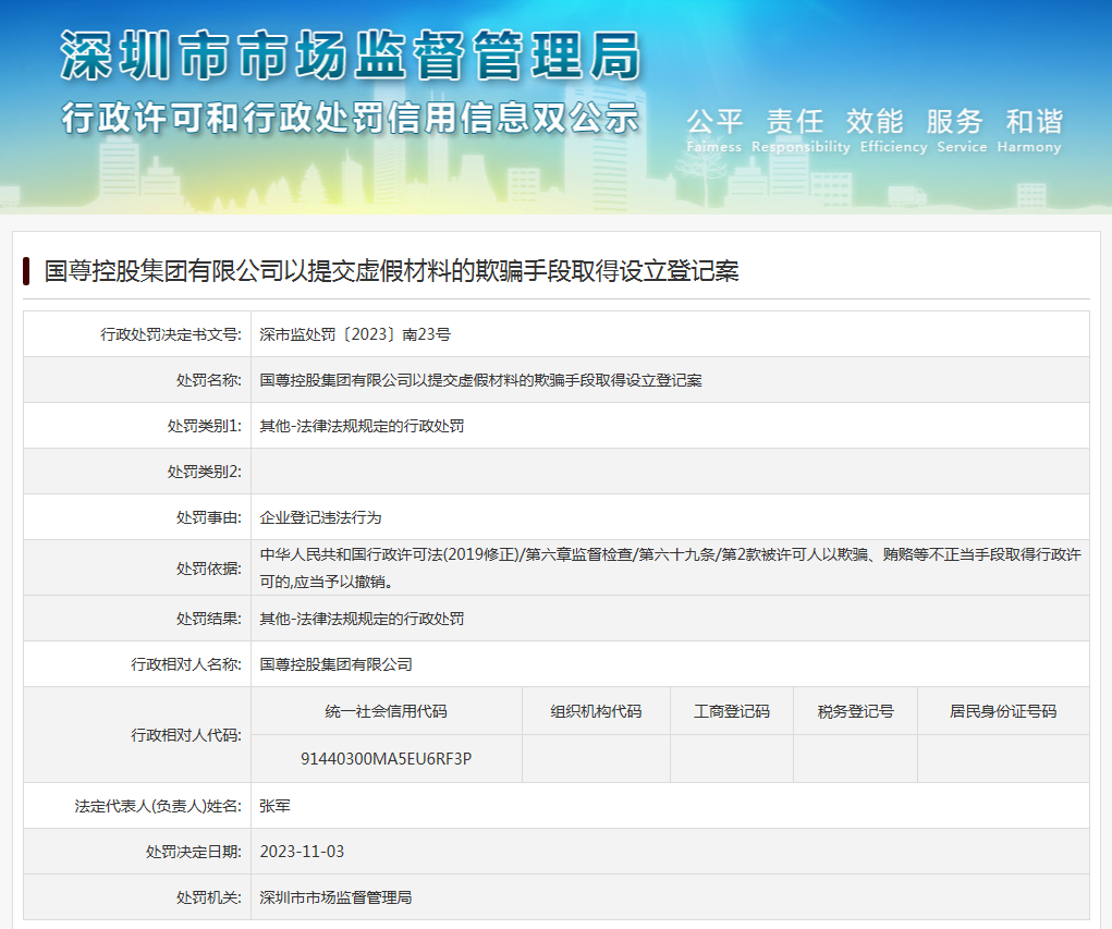 中國質(zhì)量新聞網(wǎng)訊 近日,深圳市市場監(jiān)督管理局發(fā)布行政處罰信息(深市監(jiān)處罰〔2023〕南23號),涉及國尊控股集團(tuán)有限公司以提交虛假材料的欺騙手段取得設(shè)立登記案。