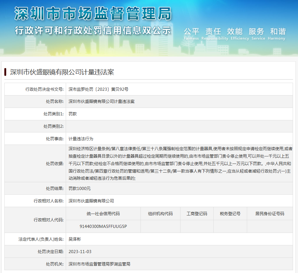中國質(zhì)量新聞網(wǎng)訊 近日,深圳市市場監(jiān)督管理局羅湖監(jiān)管局發(fā)布行政處罰信息(深市監(jiān)羅處罰〔2023〕黃貝92號),涉及深圳市伙盛眼鏡有限公司計量違法案。