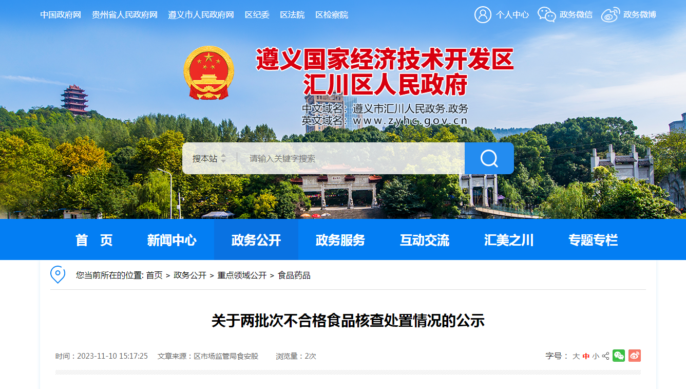 中國質(zhì)量新聞網(wǎng)訊 11月10日,貴州省遵義市匯川區(qū)市場監(jiān)督管理局公示兩批次不合格食品核查處置情況。