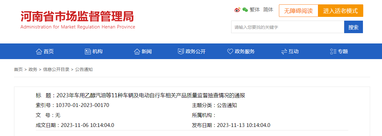 中國質(zhì)量新聞網(wǎng)訊 11月13日,河南省市場監(jiān)督管理局網(wǎng)站通報2023年車用乙醇汽油等11種車輛及電動自行車相關(guān)產(chǎn)品質(zhì)量監(jiān)督抽查情況。