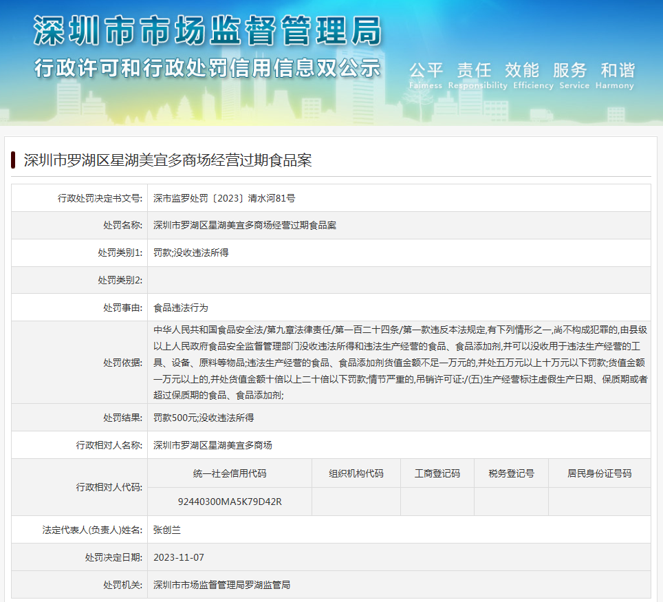 中國(guó)質(zhì)量新聞網(wǎng)訊 近日,深圳市市場(chǎng)監(jiān)督管理局羅湖監(jiān)管局發(fā)布行政處罰信息(深市監(jiān)羅處罰〔2023〕清水河81號(hào)),涉及深圳市羅湖區(qū)星湖美宜多商場(chǎng)經(jīng)營(yíng)過期食品案。