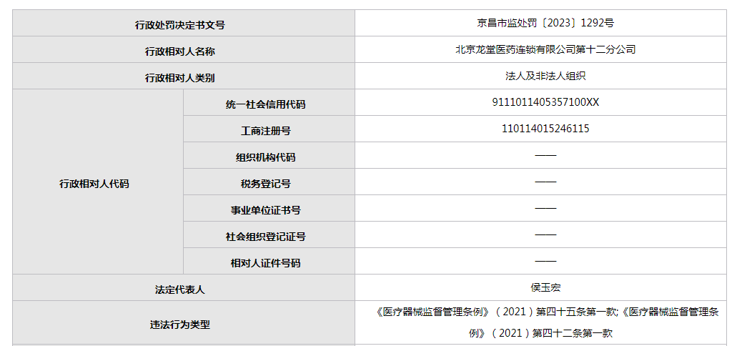 公開資料顯示,北京龍?zhí)冕t(yī)藥連鎖有限公司第十二分公司成立于2012年9月,負責人為侯玉宏。北京龍?zhí)冕t(yī)藥連鎖有限公司則成立于2011年1月,法定代表人為侯玉亮。經營范圍包括零售藥品;銷售食品;銷售醫(yī)療器械、日用品;技術轉讓;經濟信息咨詢(不含中介)。