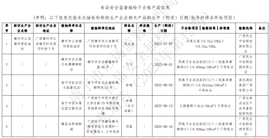 所有抽檢樣品遵循隨機(jī)抽樣原則。本次共抽檢食品和食用農(nóng)產(chǎn)品共255批次,合格244批次,不合格11批次。不合格食品涉及勺子、湯盆、小碗、大面碗、標(biāo)識橫州市云表鎮(zhèn)何君檢油坊生產(chǎn)的花生油等。