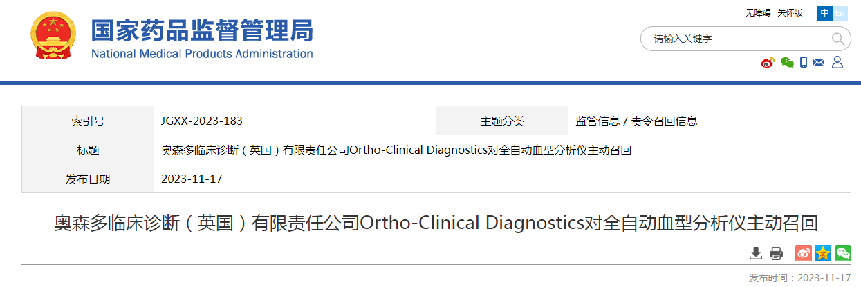 奧森多醫(yī)療器械貿(mào)易(中國(guó))有限公司報(bào)告,由于在特定檢測(cè)中可能發(fā)生試劑抗體攜帶污染,導(dǎo)致特定型號(hào)全自動(dòng)血型分析儀產(chǎn)生間歇性假陽(yáng)性結(jié)果,生產(chǎn)商奧森多臨床診斷(英國(guó))有限責(zé)任公司Ortho-Clinical Diagnostics對(duì)其生產(chǎn)的全自動(dòng)血型分析儀ORTHO VISION? Analyzer(國(guó)械注進(jìn)20173222376)、全自動(dòng)血型分析儀ORTHO VISION? Max Analyzer(國(guó)械注進(jìn)20173222355)主動(dòng)召回。召回級(jí)別為二級(jí)召回。涉及產(chǎn)品的型號(hào)、規(guī)格及批次等詳細(xì)信息見(jiàn)《醫(yī)療器械召回事件報(bào)告表》。