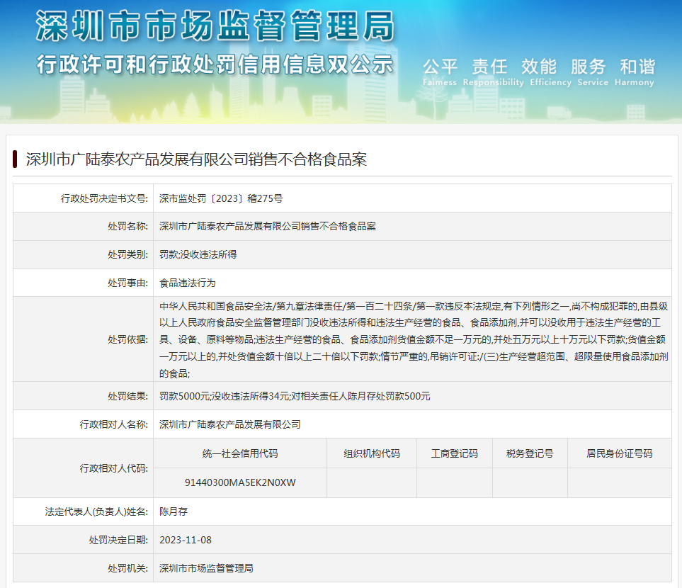 中國質量新聞網訊 近日,深圳市市場監(jiān)督管理局發(fā)布行政處罰信息(深市監(jiān)處罰〔2023〕稽275號),涉及深圳市廣陸泰農產品發(fā)展有限公司銷售不合格食品案。