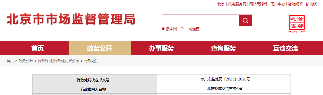 中國質(zhì)量新聞網(wǎng)訊 近日,北京市大興區(qū)市場監(jiān)督管理局對北京鏡成商貿(mào)有限公司作出行政處罰。行政處罰決定書文號:京興市監(jiān)處罰〔2023〕2028號。