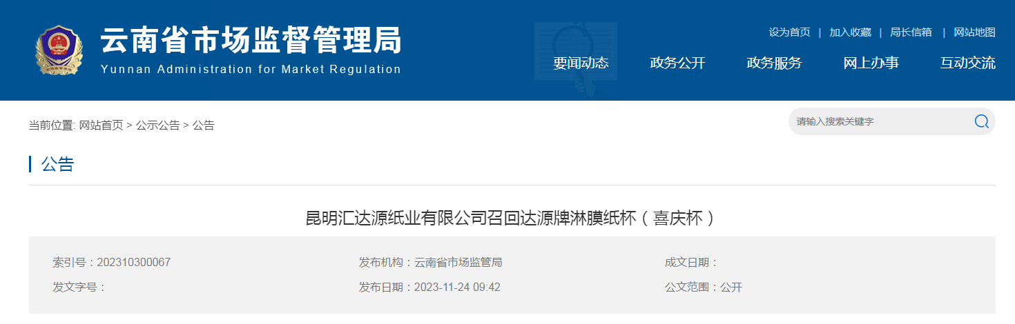 日前,昆明匯達(dá)源紙業(yè)有限公司按照《消費(fèi)品召回管理暫行規(guī)定》的要求,向云南省市場(chǎng)監(jiān)督管理局備案了召回計(jì)劃,將自即日起,召回2023年2月21日至2023年7月21日生產(chǎn)的達(dá)源牌淋膜紙杯(喜慶杯),100只/袋、230ml/只,涉及數(shù)量2520袋。