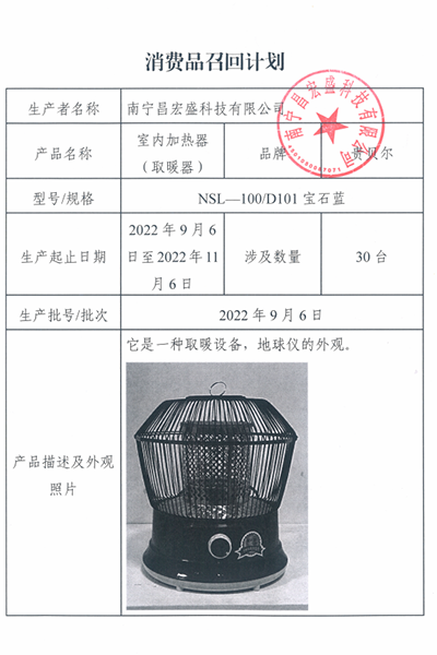 日前,南寧昌宏盛科技有限公司按照《消費品召回管理暫行規(guī)定》的要求,主動向廣西壯族自治區(qū)市場監(jiān)督管理局報告了召回計劃,將自即日起,召回2022年9月6日至2022年11月6日期間生產(chǎn)的型號NSL-100/D101寶石藍(lán)的貴貝爾品牌室內(nèi)加熱器(取暖器),涉及數(shù)量為30臺。