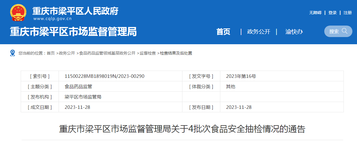 重慶市梁平區(qū)市場監(jiān)督管理局關于4批次食品安全抽檢情況的通告