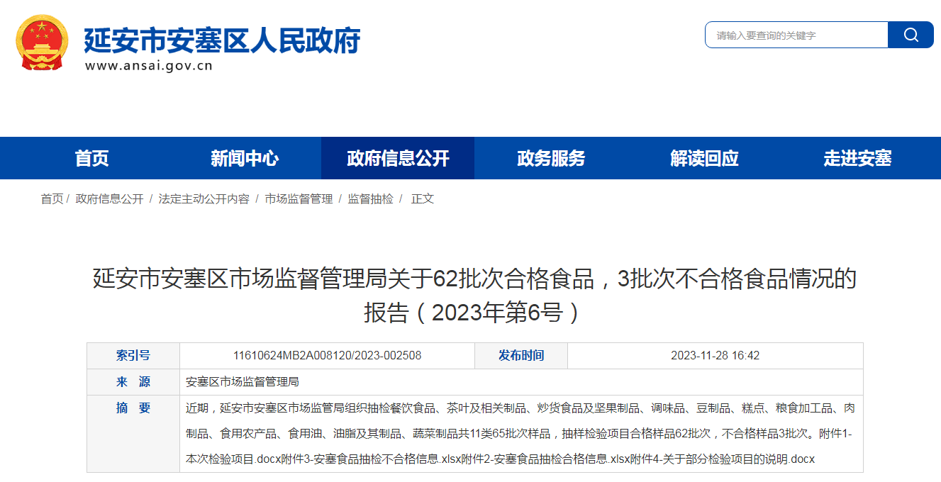 延安市安塞區(qū)市場監(jiān)督管理局關(guān)于62批次合格食品,3批次不合格食品情況的報告(2023年第6號)