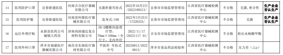 為加強醫(yī)療器械質(zhì)量監(jiān)督管理,保障醫(yī)療器械產(chǎn)品使用安全有效,江西省藥品監(jiān)督管理局按照2023年度全省醫(yī)療器械抽檢工作方案,持續(xù)對本省醫(yī)療器械生產(chǎn)、經(jīng)營和使用環(huán)節(jié)實施了監(jiān)督抽樣檢驗。本期對已核實的17批次不合格產(chǎn)品予以公告,具體抽檢信息如下: