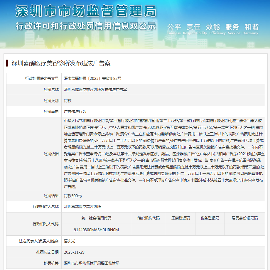 深圳喜鵲醫(yī)療美容診所發(fā)布違法廣告案