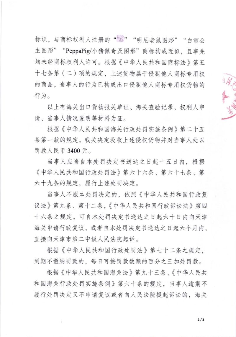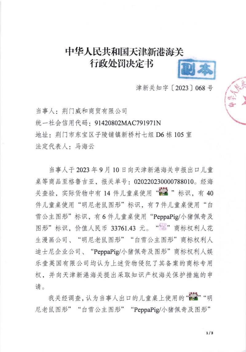 天津新港海關關于荊門威和商貿有限公司出口侵犯“明尼老鼠圖形”等商標專用權兒童桌案行政處罰決定書(津新關知字〔2023〕068號)