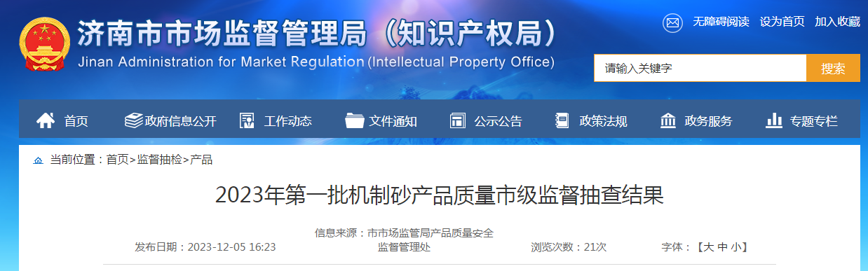 | 1 | 機制砂 | 流通領(lǐng)域 | 濟南旺鑫建材有限公司 | 91370112MA3RAKYR3G | 章丘市文祖錦屏建材有限公司 | 2023-08-26/2023-08-26 | III類 | / | 合格 | 山東騰翔產(chǎn)品質(zhì)量檢測有限公司 |