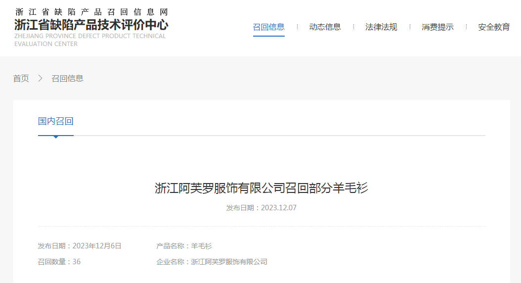 日前,浙江阿芙羅服飾有限公司按照《消費(fèi)品召回管理暫行規(guī)定》的要求,向浙江省市場(chǎng)監(jiān)督管理局報(bào)告了召回計(jì)劃,將自即日起,召回2023年6月期間制造的藍(lán)綠色95cm羊毛衫,涉及數(shù)量為36件。