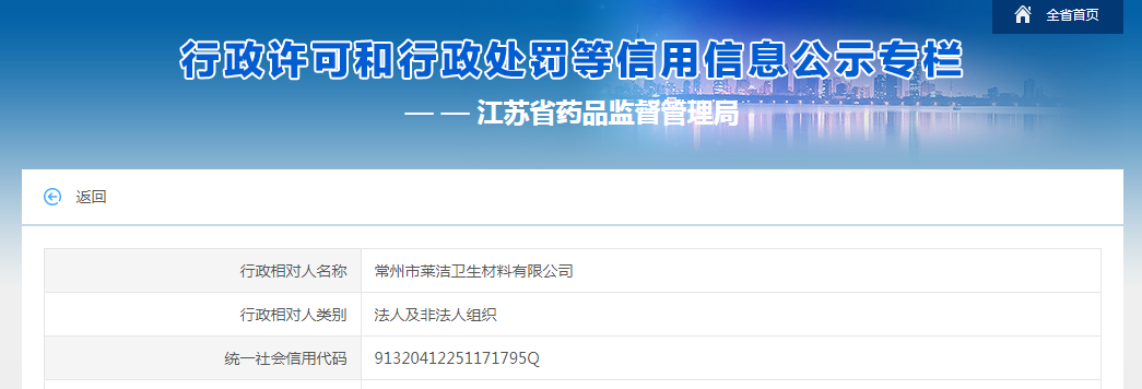行政相對人名稱常州市萊潔衛(wèi)生材料有限公司