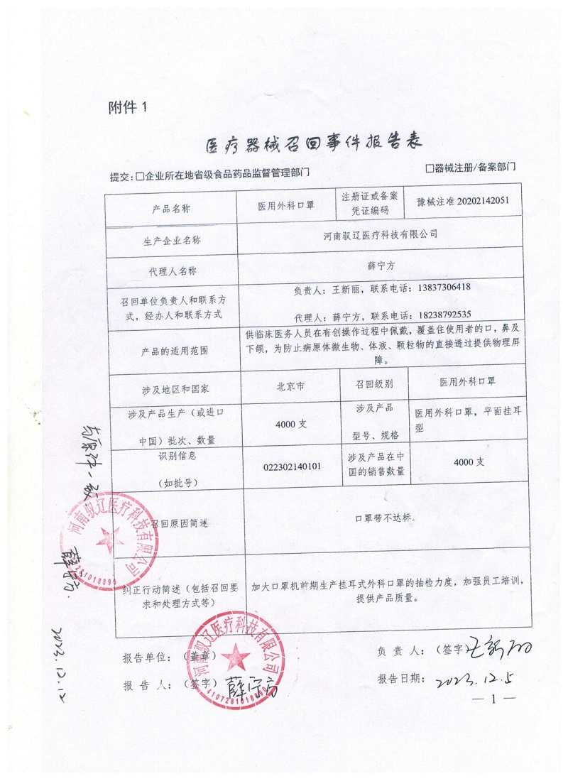 河南馭遼醫(yī)療科技有限公司報(bào)告,由于其生產(chǎn)的一批次醫(yī)用外科口罩不符合規(guī)定,企業(yè)對(duì)其主動(dòng)召回,召回級(jí)別為三級(jí)。召回產(chǎn)品的型號(hào)、規(guī)格及批次等詳細(xì)信息見《醫(yī)療器械召回事件報(bào)告表》。