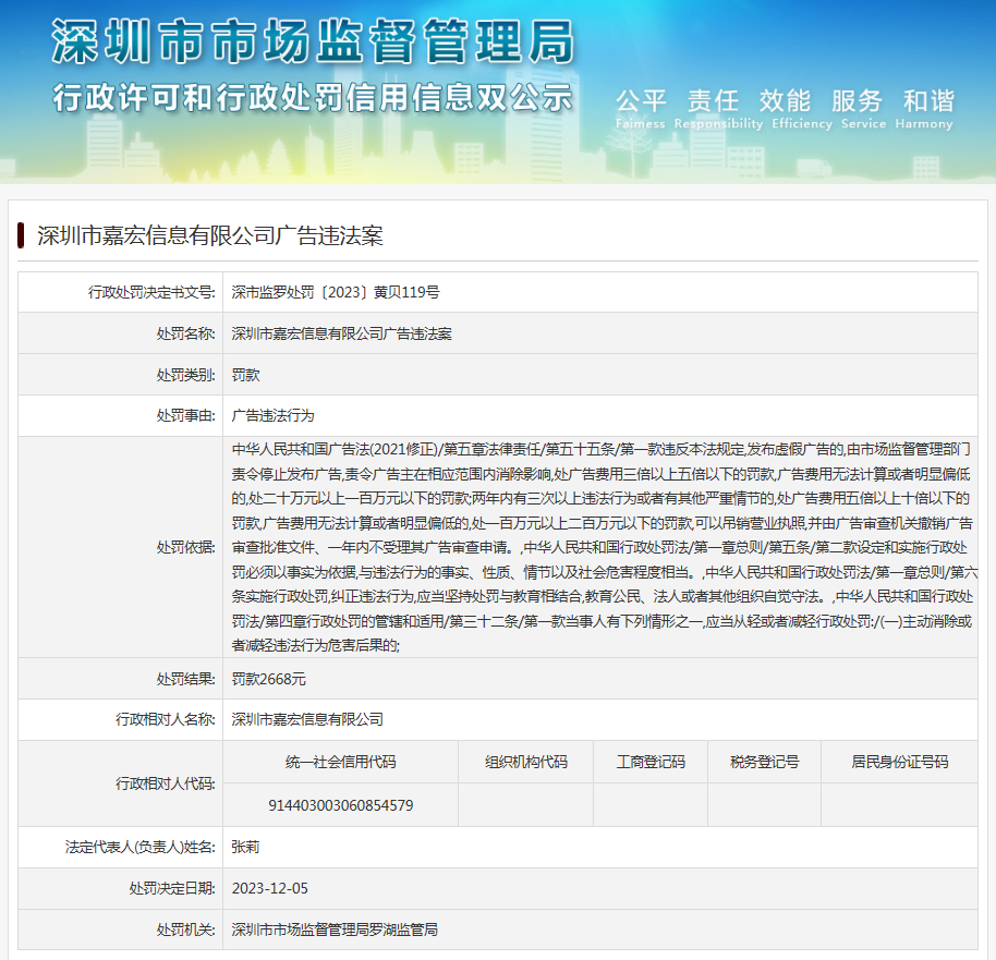 深圳市嘉宏信息有限公司廣告違法案
