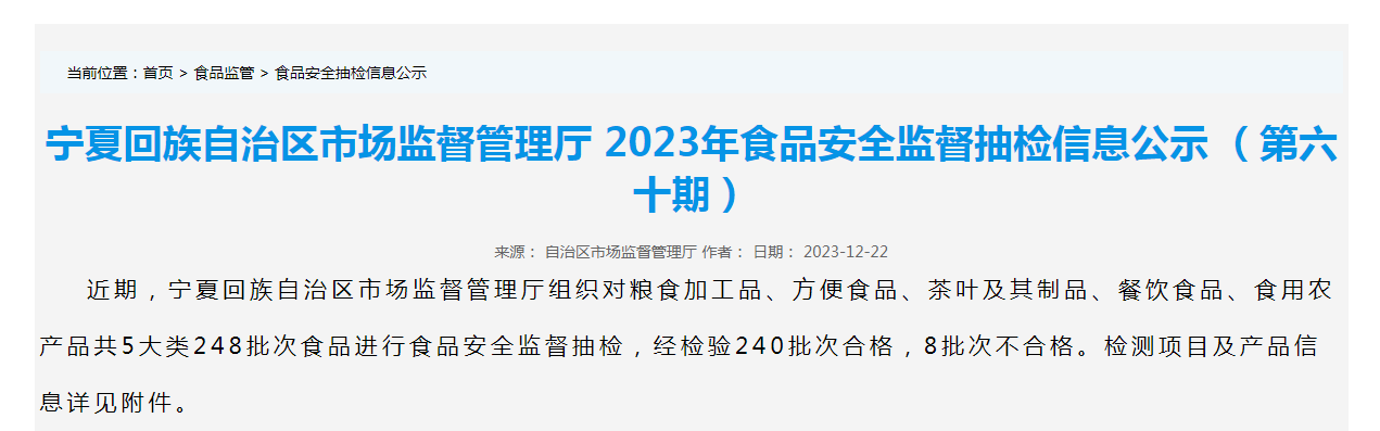 近期,寧夏回族自治區(qū)市場(chǎng)監(jiān)督管理廳組織對(duì)糧食加工品、方便食品、茶葉及其制品、餐飲食品、食用農(nóng)產(chǎn)品共5大類248批次食品進(jìn)行食品安全監(jiān)督抽檢,經(jīng)檢驗(yàn)240批次合格,8批次不合格。檢測(cè)項(xiàng)目及產(chǎn)品信息詳見(jiàn)附件。