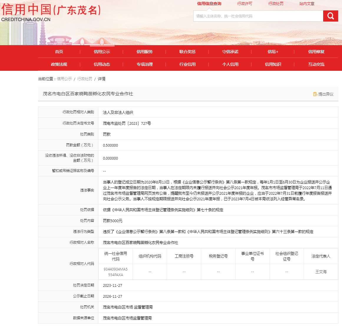 茂名市電白區(qū)百家曉鴨苗孵化農(nóng)民專業(yè)合作社不按規(guī)定期限報送并向社會公示年度報告案