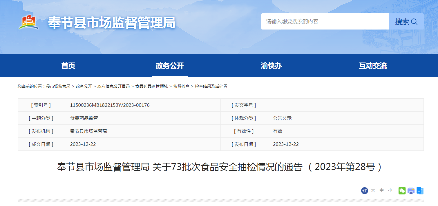 奉節(jié)縣市場(chǎng)監(jiān)督管理局關(guān)于73批次食品安全抽檢情況的通告(2023年第28號(hào))