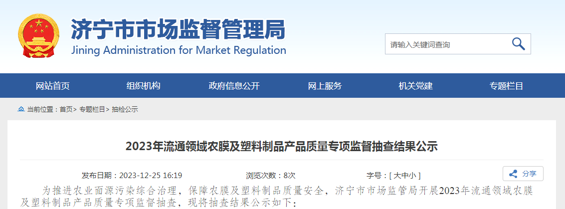 為推進(jìn)農(nóng)業(yè)面源污染綜合治理,保障農(nóng)膜及塑料制品質(zhì)量安全,濟(jì)寧市市場(chǎng)監(jiān)管局開(kāi)展2023年流通領(lǐng)域農(nóng)膜及塑料制品產(chǎn)品質(zhì)量專(zhuān)項(xiàng)監(jiān)督抽查,現(xiàn)將抽查結(jié)果公示如下: