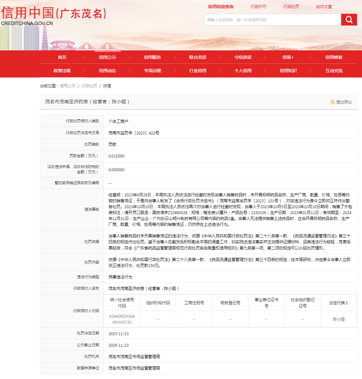茂名市茂南圣濟(jì)藥房銷(xiāo)售藥品時(shí)未開(kāi)具銷(xiāo)售憑證案