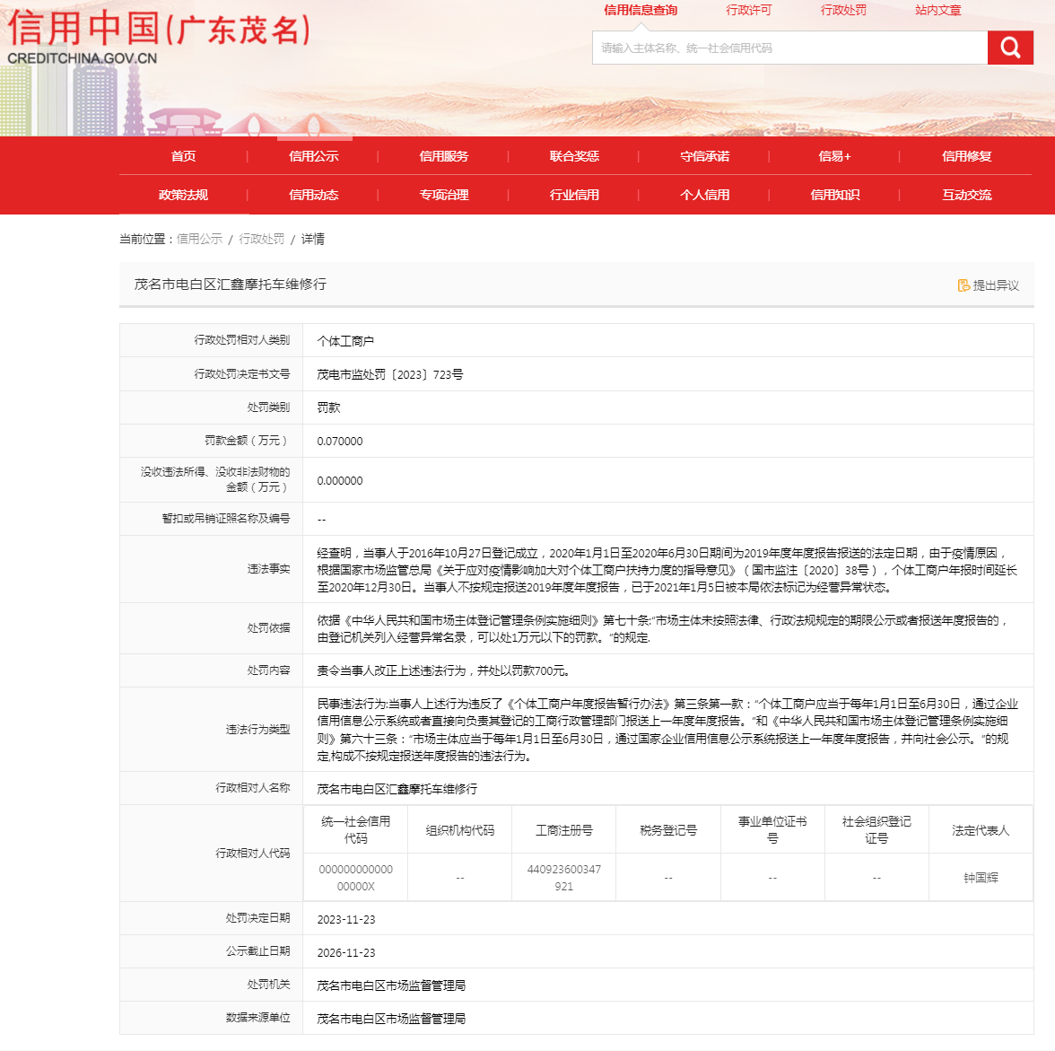 茂名市電白區(qū)匯鑫摩托車維修行未按規(guī)定報(bào)送年度報(bào)告案