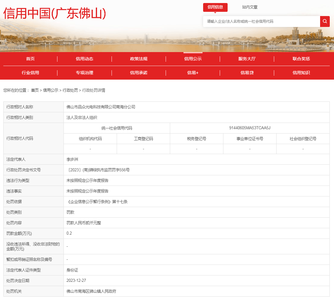 佛山市品眾光電科技有限公司南海分公司未按照規(guī)定公示年度報告案