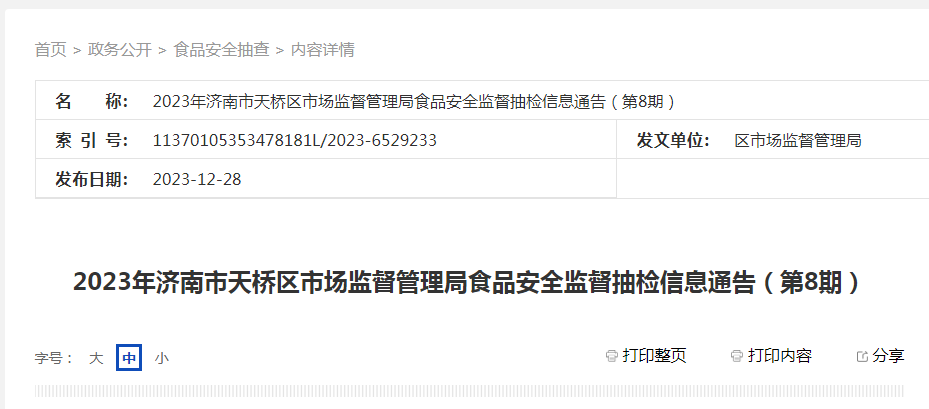 2023年濟南市天橋區(qū)市場監(jiān)督管理局食品安全監(jiān)督抽檢信息通告(第8期)