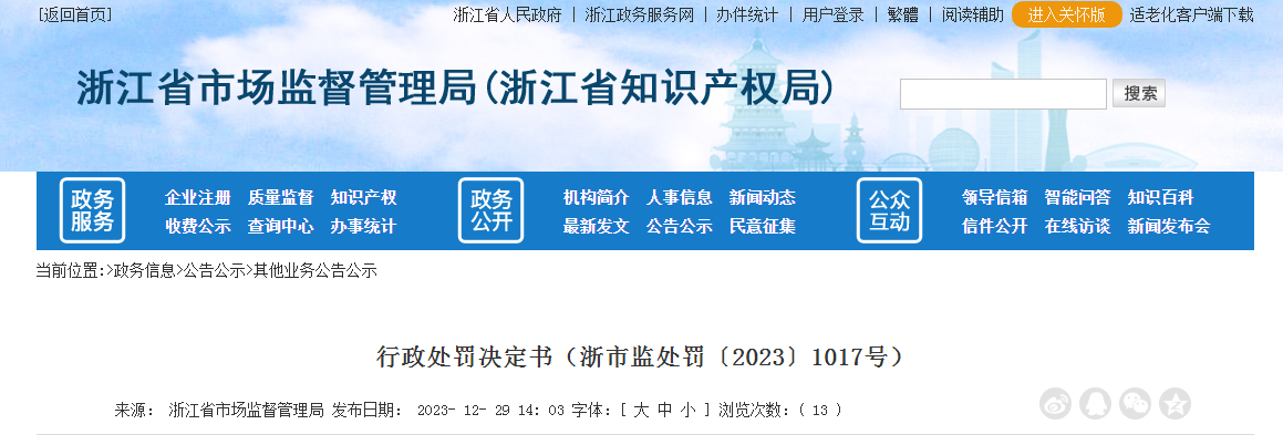 浙市監(jiān)處罰〔2023〕1017號(hào)