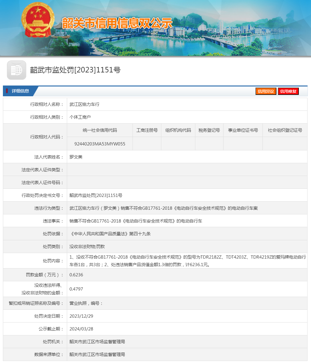 【廣東韶關(guān)】武江區(qū)銘力車行銷售不合格的電動(dòng)自行車案