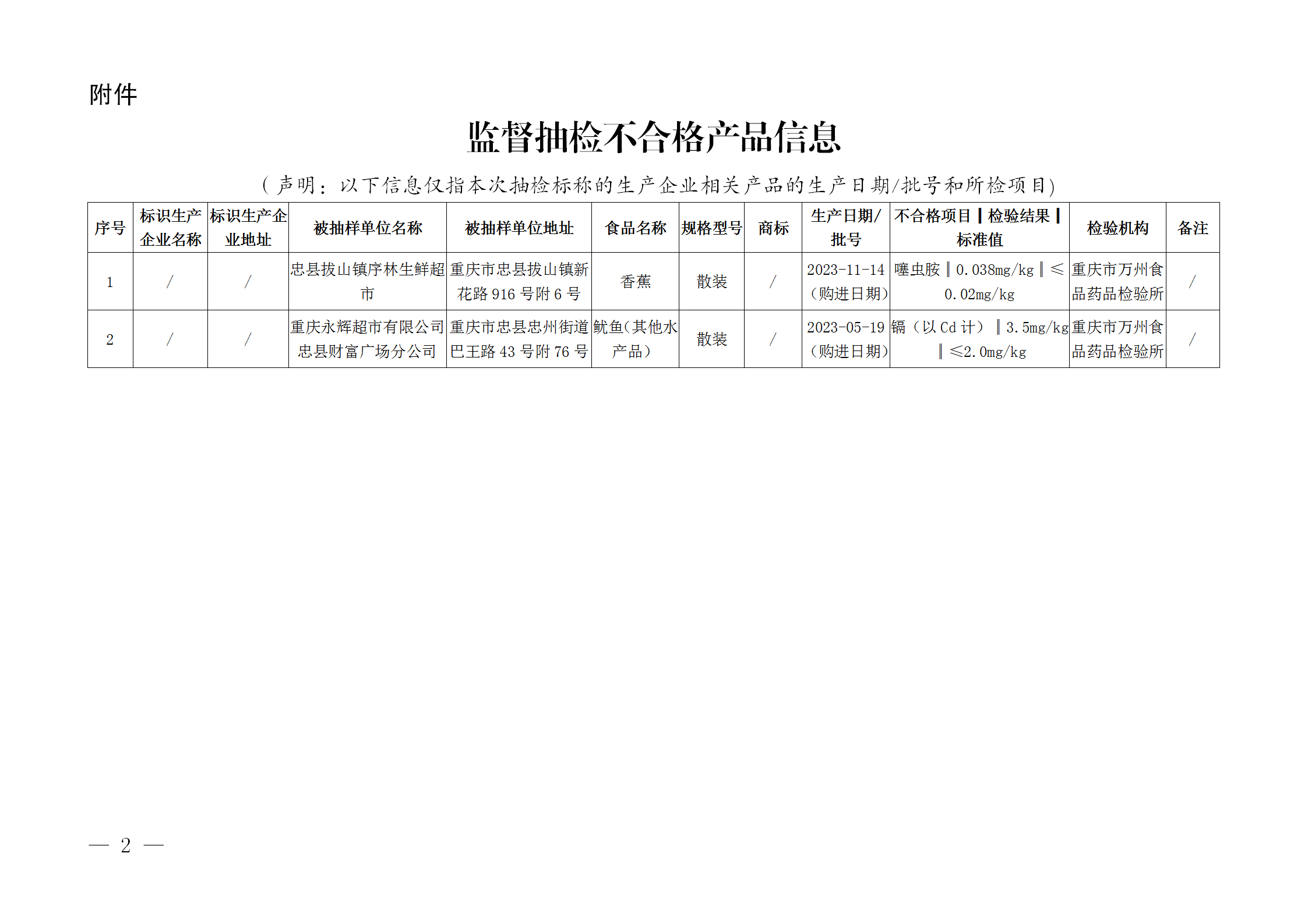 重慶市忠縣市場(chǎng)監(jiān)督管理局關(guān)于2批次食品抽檢不合格情況的通告(2023年第19號(hào))